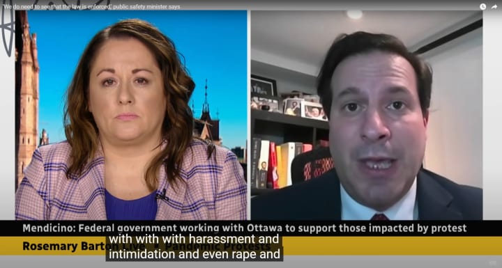 In this video, we have the Minister of Public Safety Marco Mendicino tells CBC chief political correspondent Rosemary Barton that the federal government is working with local authorities and that he’s been ‘very troubled’ by the reports from Ottawa residents of harassment and disruptions due to ongoing protests; but in the interview, he states that the Freedom Convoy caused RAPE. Yes, you read correctly, RAPE. Which obviously is not true!