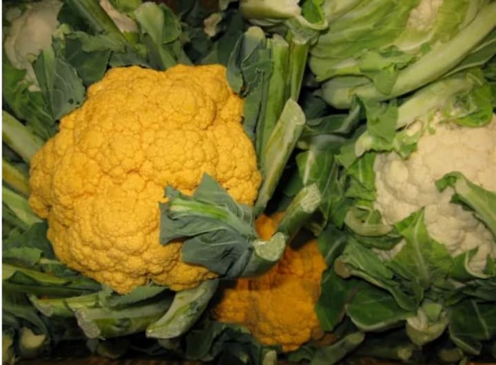 Orange cauliflower gets its coloring from additional beta-carotene, which also gives carrots their color. Orange cauliflower's vitamin A content is about 25 times higher than that of other colors, which makes orange cauliflower healthier. It is called “cheddar” cauliflower because it has the color of cheese, but it tastes nothing like cheese. Its flavor is mild, slightly sweet, and creamy, like the purple cauliflower. Unlike purple cauliflower, which tends to lose its color when cooked, the orange cauliflower's color usually becomes even more intense.