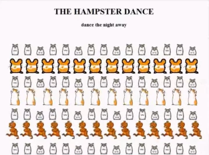 2 years after the creation of the Dancing Baby meme, another early meme emerged. Canadian art student Deidre LaCarte created the Hamster Dance in 1998 as a GeoCities page. Deidre, her best friend, and her sister were having a competition to see who could create a webpage that received the most traffic, so Deidre used the web hosting service GeoCities to create a homepage for her pet hamster, Hampton. The site featured 392 animated dancing hamsters.