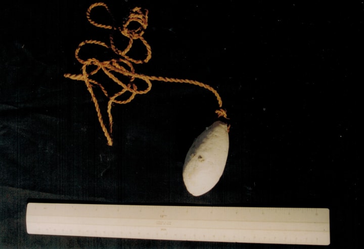 1. Long sinews of coconut fibre twisted into fine, strong strings 9 to 12 metres in length. Each string was securely tied to a stone weight through a hole made at one end.