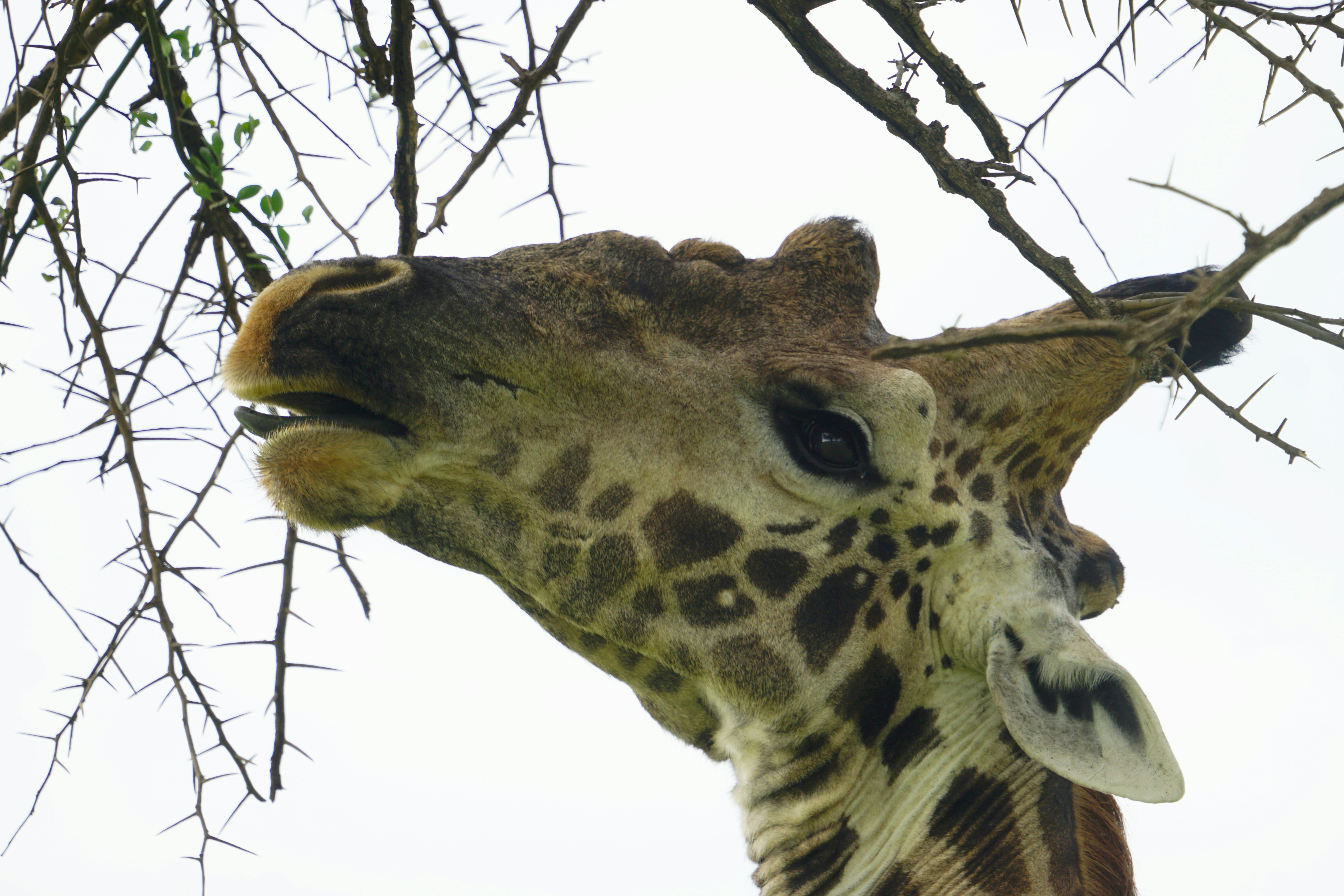 These acacia trees produce little packages of protein and fat called "Beltian bodies" to attract ants. The insects live in a symbiotic relationship with the acacia, providing a vicious active defense against anything undeterred by thorns in exchange for food and shelter.
