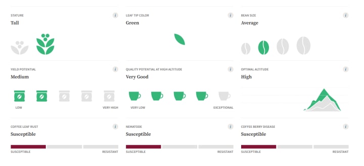 - Kent: India, Kent is resistant to coffee leaf rust, lower yields.