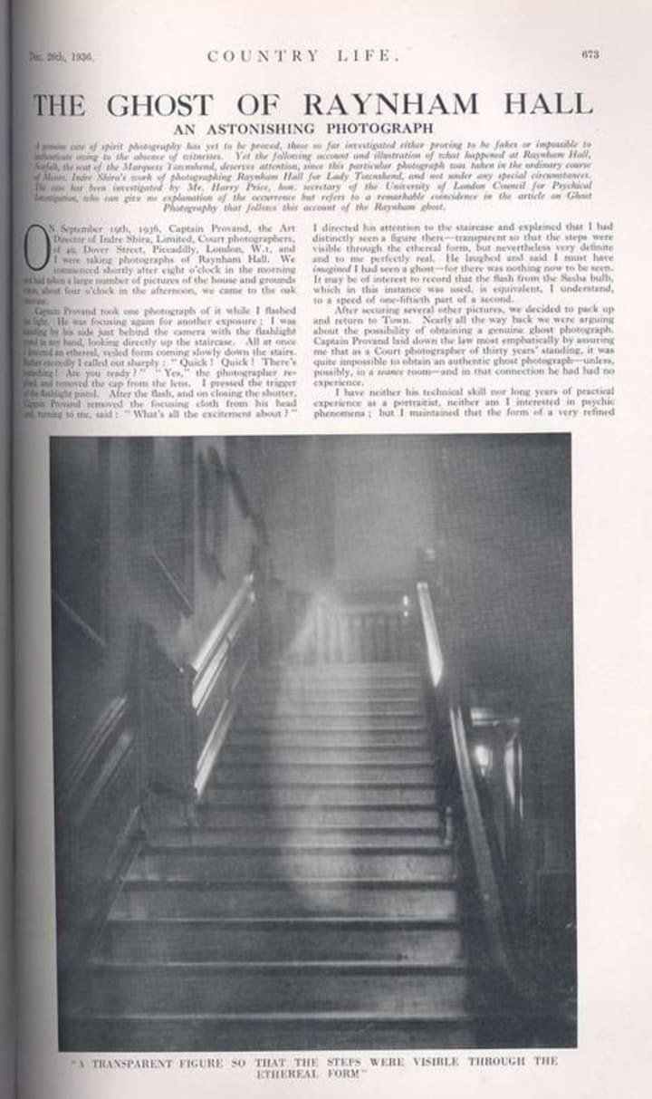 Ten years later, on September 19, 1936, the most famous sighting of the Brown Lady of Raynham Hall occurred. Captain Hubert C. Provand and his assistant, Indre Shira, were in Raynham Hall taking photos for an upcoming article in Country Life magazine. They had just finished taking a picture of Raynham Hall's grand staircase and were setting up for a second one when they saw "a vapoury form gradually assuming the appearance of a woman" moving toward them down the stairs. Provand rushed to remove the lens cap while Shira pressed the trigger for the camera's flash. Provand and Shira's photo is below, the same one you saw at the beginning of reading this. It is now one of the most famous ghost photos in existence.