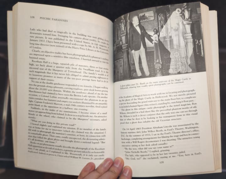 Supposedly, magicians John Booth and Ron Wilson easily duplicated the photo at the grand staircase of The Magic Castle in Hollywood by having Ron toss a bed sheet over himself, and supposedly their faked image looked very similar to the Raynham Hall photograph. Strangely, I couldn't find an actual copy of the photo anywhere, so I tracked down the rare, original book (Psychic Paradoxes by John Booth) from 1986 that claims they did this and ordered a copy. Luckily, it arrived quickly. Below are photos of the three pages in question that some people claim as irrefutable proof that the Provand and Shira photo was a hoax because John Booth and Ron Wilson made such a convincing version with just a bed sheet and double exposure.