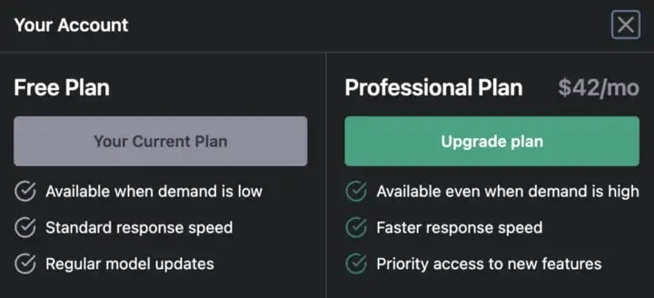 The good news is that the model for both plans is the same, so users won’t have to sacrifice quality for affordability. The professional plan, however, does offer some additional benefits. For one, it will be available even when demand is high, ensuring that users can always access the model when they need it. Additionally, response speed will be faster and priority access to new features will be given to professional plan users.