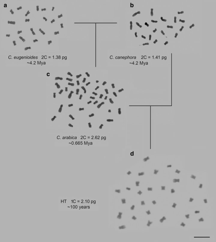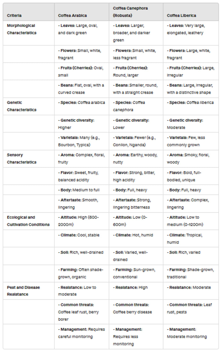 Chromosomes: Arabica has a diploid chromosome set (44 chromosomes), while Robusta and Liberica have a haploid chromosome set (22 chromosomes).