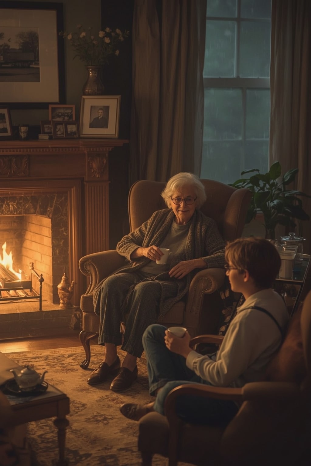 The rain had just begun to patter against the windowpanes when I walked into the living room, the scent of freshly brewed tea lingering in the air. Nana sat in her favorite armchair by the fireplace, her grey shawl wrapped tightly around her shoulders, a book resting on her lap but forgotten. Her eyes sparkled, not with the firelight, but with the quiet joy of seeing me.