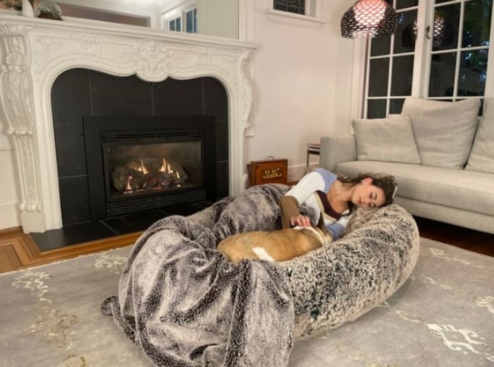 On a cold winter night, you and your dog can relax by the fireplace in your Plufl. There is enough room for you and your big dog.