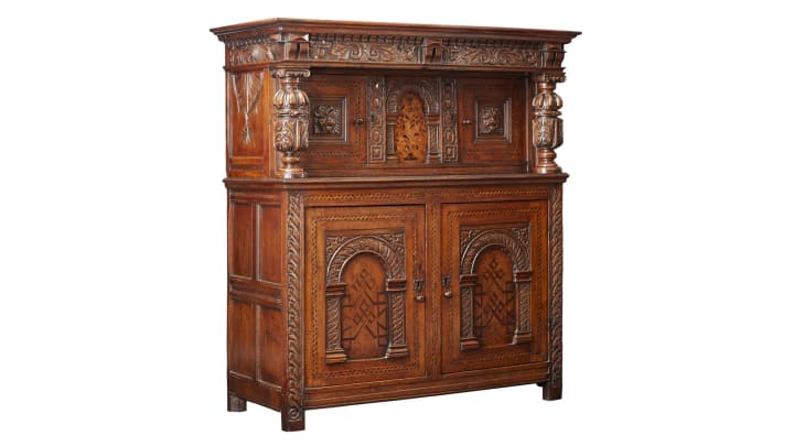 Another innovation was the “court cupboard”, with “cupboard” to be understood as a “cup board”, a board for storing cups (etc). The word “court” may be of French derivation, meaning “short”. The court cupboard was an open three-tiered side-table designed for housing and displaying the family’s best crockery. The cupboard was therefore also a prestige piece, often highly decorated with inlay or strap-work (intricate repeated geometrical carving in low relief), and with legs in the shape of heraldic beasts. Later cupboards were made with doors, so that they began to resemble what we now understand by the term.