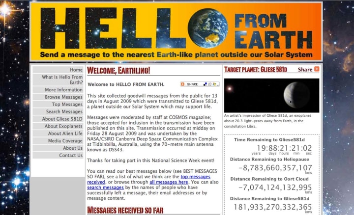 That’s exactly the question people faced a decade ago. In an Australian project called HELLO FROM EARTH, almost 26,000 people wrote a 160-character message that was sent to Gliese 581d, an Earth-like planet 20 light-years away. That powerful transmission, sent by NASA, has now passed the halfway mark on its long, lonely journey through the silent cosmos.