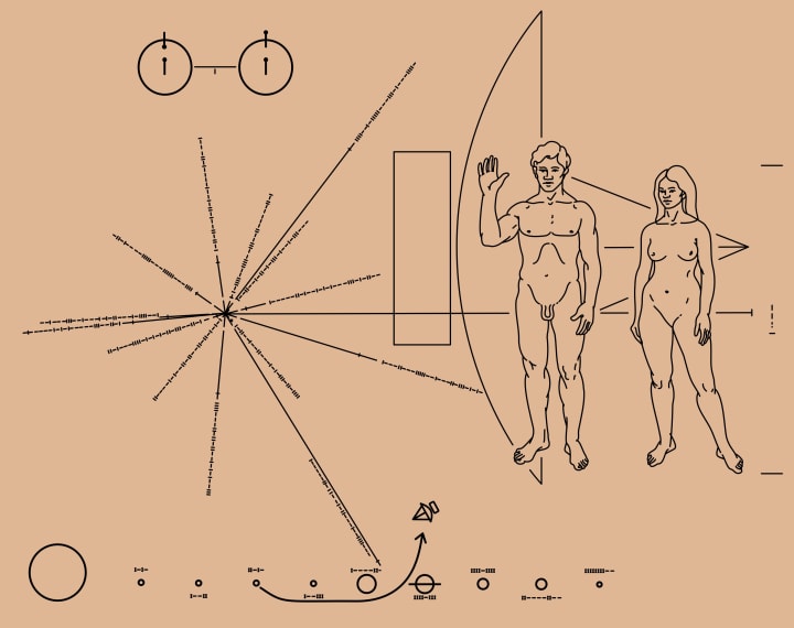 To be fair, NASA had reason to be cautious. In 1973, they attached a gold-anodised aluminium plaque to the Pioneer 10 and Pioneer 11 space probes, which would become the first to leave the solar system, with an illustrated message in case either was found by extraterrestrials. It depicted two hydrogen atoms, an array of lines and dashes — a kind cosmic address for our Sun on the radio spectrum of the galaxy — as well as an illustration of a naked man and woman, showing what our species look like.