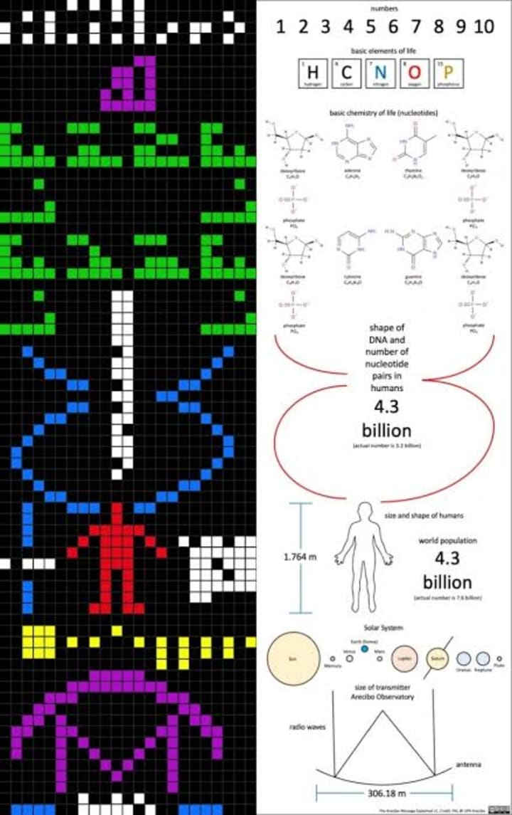 The second message, sent by astronomers at the National Astronomical Observatory of Japan in 1983, was aimed at Altair, the brightest star in the constellation of Aquila, and arrived in 2017. It consisted of 13 binary-encoded images (71 x 71 pixels each) depicting a diagram of our solar system, the location of Earth, the known chemical elements and the basic structure of DNA. Since Altair is 16.7 light-years away, if there are Altairians and they decode it, the earliest we’ll hear back from them is 2034.
