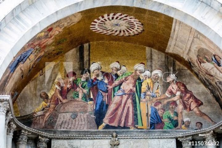 There Mark remained in Alexandria until AD 828 when it was believed that relics of his body were stolen by two Venetian merchants — aided by two Greek monks — and removed to Venice. Today, in a mosaic in San Marco’s (St Mark’s) Basilica in Venice, a visitor can see sailors delivering the body hidden beneath pork and cabbage leaves so as to escape detailed inspection by Muslim guards in Alexandria, who would not have touched the “unclean” meat.