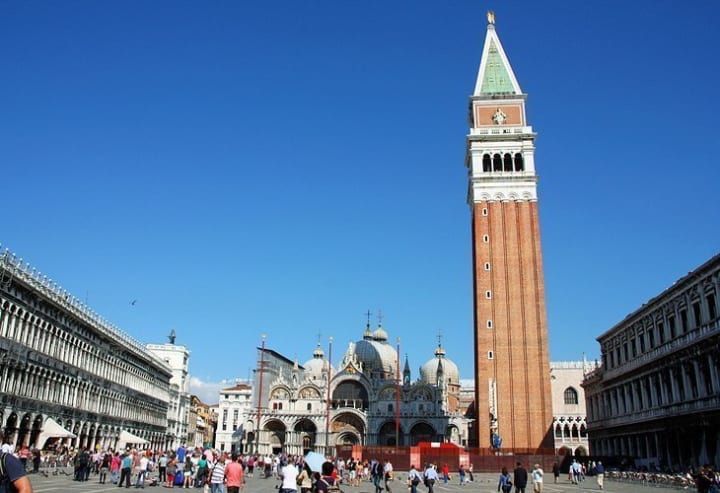 San Marco’s is the most popular destination in Venice, surrounded by Piazza San Marco (St Mark’s Square), with the Campanile (bell tower) across the square from the basilica. This bell tower is the model for Sather Tower at the University of California, Berkeley.