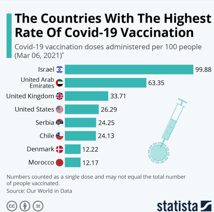 So far, 320 million vaccination doses have been administered globally. Israel leads in the percentage of its population vaccinated, at more than 50%. And despite struggling to contain the virus, the U.S. leads the world in terms of absolute doses administered at almost 94 million, or about 30% of the global total. Roughly 33 million people in the US are fully vaccinated, about 10% of the population.