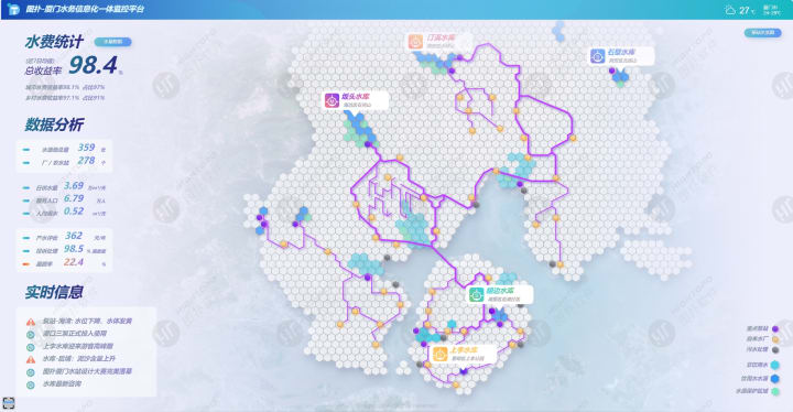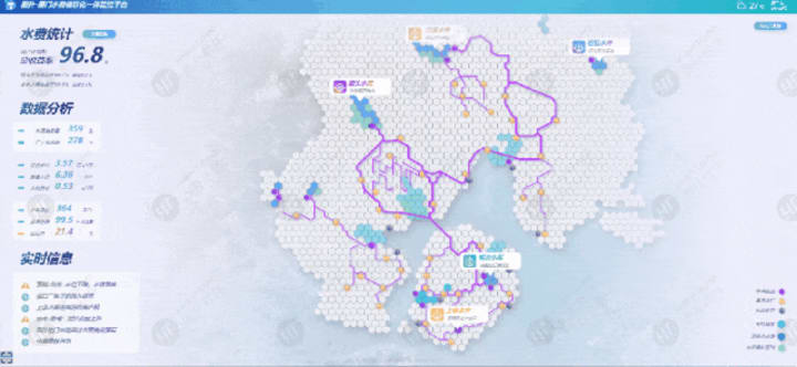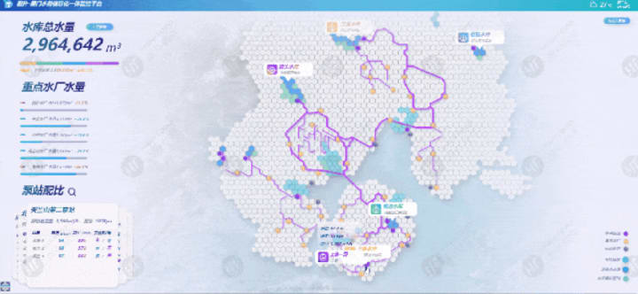 This demonstration showcases a 2D smart water management map, utilizing Xiamen city as a case study. The design departs from conventional satellite mapping by implementing a streamlined hexagonal color block layout to represent the urban landscape. Different color blocks are used to indicate the locations of pump stations, water plants, sewage treatment plants, water sources, and water source protection areas. Rivers are depicted using minimalist lines, making the urban water monitoring system clear and straightforward.