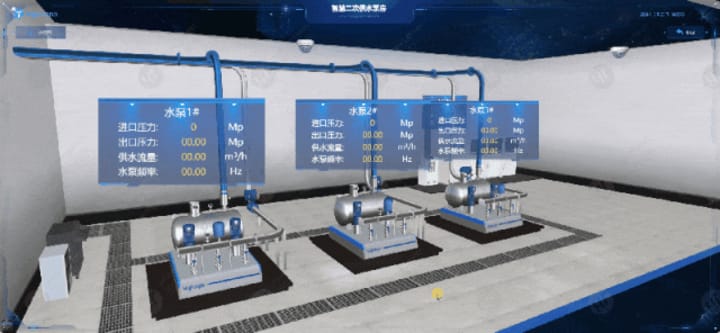 Entering the localized 3D scene of the pump room enables the display of equipment spatial positions as well as comprehensive presentation of data such as water supply flow, pump frequency, inlet and outlet pressure, as well as water quality parameters like turbidity, pH value, and residual chlorine. This provides a visual monitoring interface for the actual operation of the water supply system.