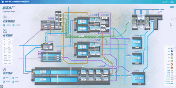 The “HT for Web” graphics engine, combined with a 2.5D design style, renders the key nodes of each process stage in the wastewater treatment plant and connects them to the underground pipeline system for dynamic representation, making it easy for users to understand the connections between different process stages.