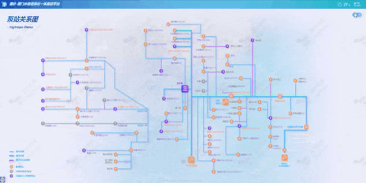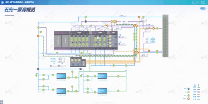 HT visualization supports displaying the urban pump room distribution in a “single map” . When hovering the mouse over a pump station node, it shows key data such as current flow rate and water level. According to the legend, the meanings of different types of icons and pipelines can be understood.