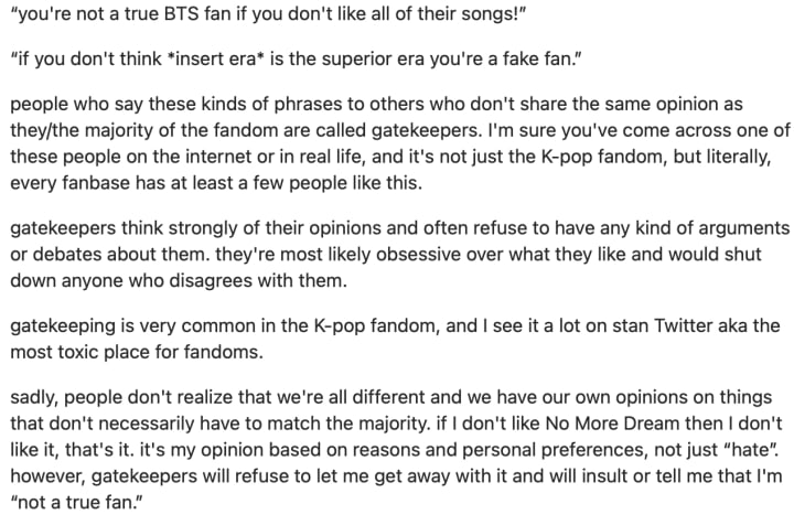 Take this comment posted on Quora, for instance, that is discussing gatekeepers and BTS stans (please don't come for me):