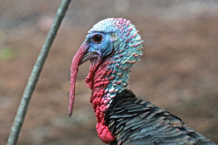 The bare heads of both the domestic and wild turkeys change colors from gray to red, blue, or white when they become excited or stressed. When they are calm, their bare heads remain the same color.