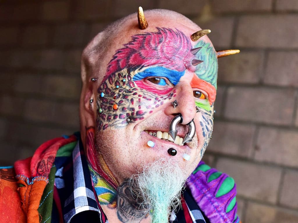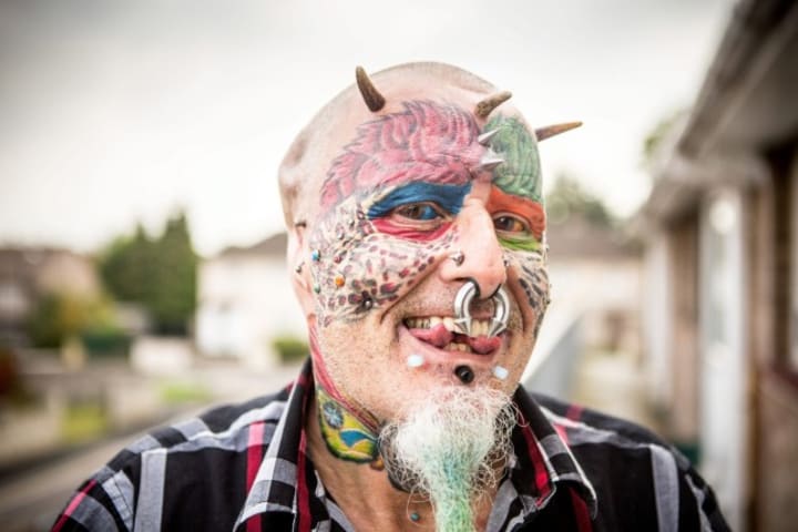 Bird lover and self-described “Parrotman” Ted Richards had his face tattooed with feathers, cut off his ears and risked going blind by having his eyes coloured with ink.