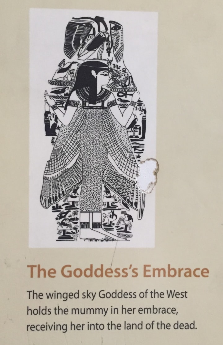 Many years after I saw Nut in the Smithsonian for the first time, I was in another Egyptian history exhibit, and happened upon another sarcophagus with her image lovingly painted on the inside. The description of it harkened back to the first I had seen, years ago, in the Smithsonian: “Nut, the winged sky goddess, lovingly takes the deceased in her arms to transport him to the afterlife.”
