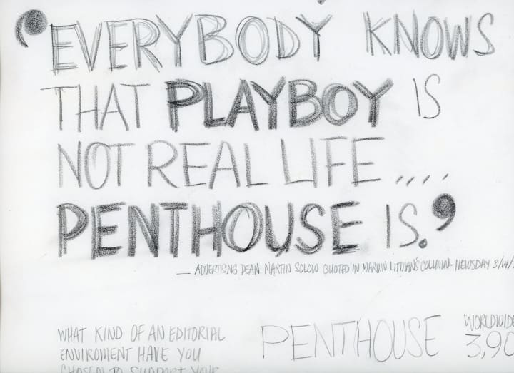 Other drawings closely reflected the published end product, such as Guccione’s mock-ups of famous Penthouse vs. Playboy advertisements. This 1973 advertisement included an angry Playboy bunny reading Penthouse, with a quote from advertising expert Martin Solow that “everybody knows that Playboy is not real life…Penthouse is.” These illustrations prove that these advertising concepts came directly from the top.
