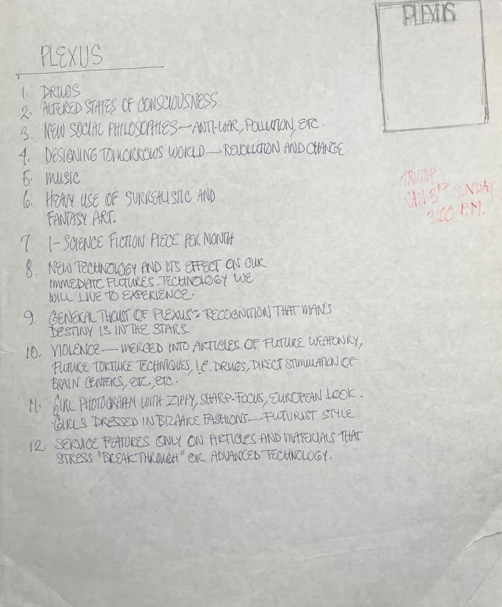 Drafts went beyond just logos and covers to include content ideas, such as those for Plexus, a publication which he planned to focus on politics and futurism. In Guccione’s brainstorming this title would include stories on everything from the recognition of “man’s destiny is in the stars” to “new social philosophies” on “anti-war, pollution, etc.” While we can see some of these topics in both Omni and Penthouse, one can only imagine the rich resource Plexus would be today for the far-out ideas current at the time of its conception. All of this brainstorming occurred in the middle of a busy work day, as Guccione also jotted down details for a meeting. His notes read simply: “Trump - Jan 3rd Sunday - 3:00 P.M.”
