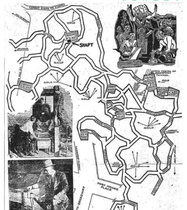 This 1934 newspaper article tells of an underground city laid out in the shape of a lizard, with its head underneath from northeast Los Angeles and its tail underneath the downtown Los Angeles library.