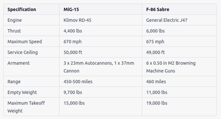 The kill ratio between the F-86 Sabre and the Mig-15 in the Korean War is still argued over. It is widely accepted that the F-86 had a significant advantage over the Mig-15 in aerial combat, with the F-86 scoring a higher number of victories against the Mig-15.