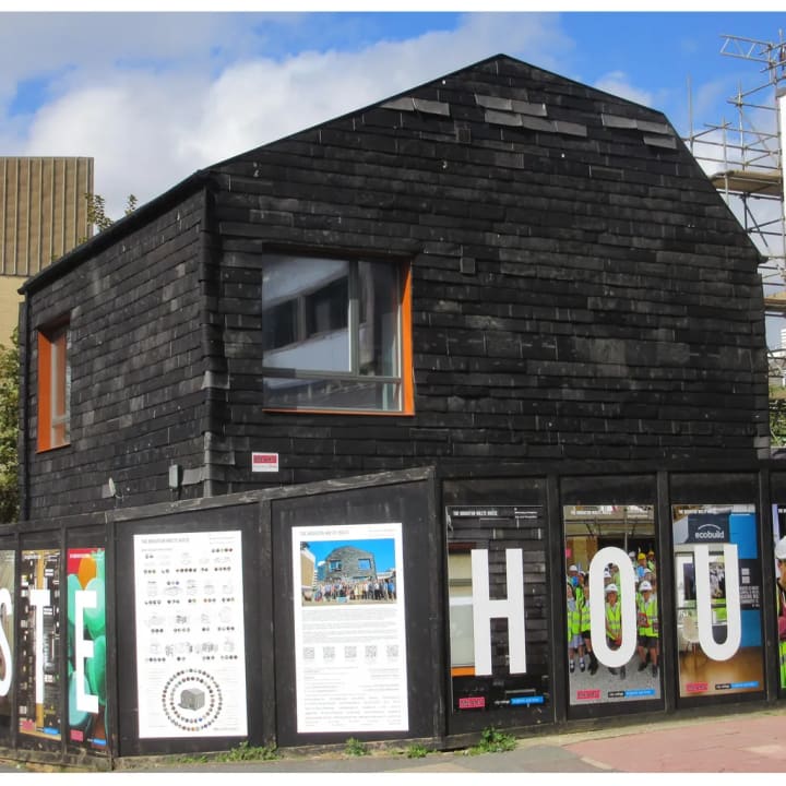 Then in 2013, UK architect Duncan Baker-Brown outdid Superuse by using over 90% waste materials to build the Brighton Waste House. Baker-Brown combined various different materials from used denim to plastic DVD cases and discarded toothbrushes to make the wall cavity insulation, and old bicycle inner tubes to provide sound and impact floor insulation. Around 10 tonnes of chalky soil destined for landfill was diverted to create rammed earth walls, while used carpet tiles rescued from an office provided exterior cladding.