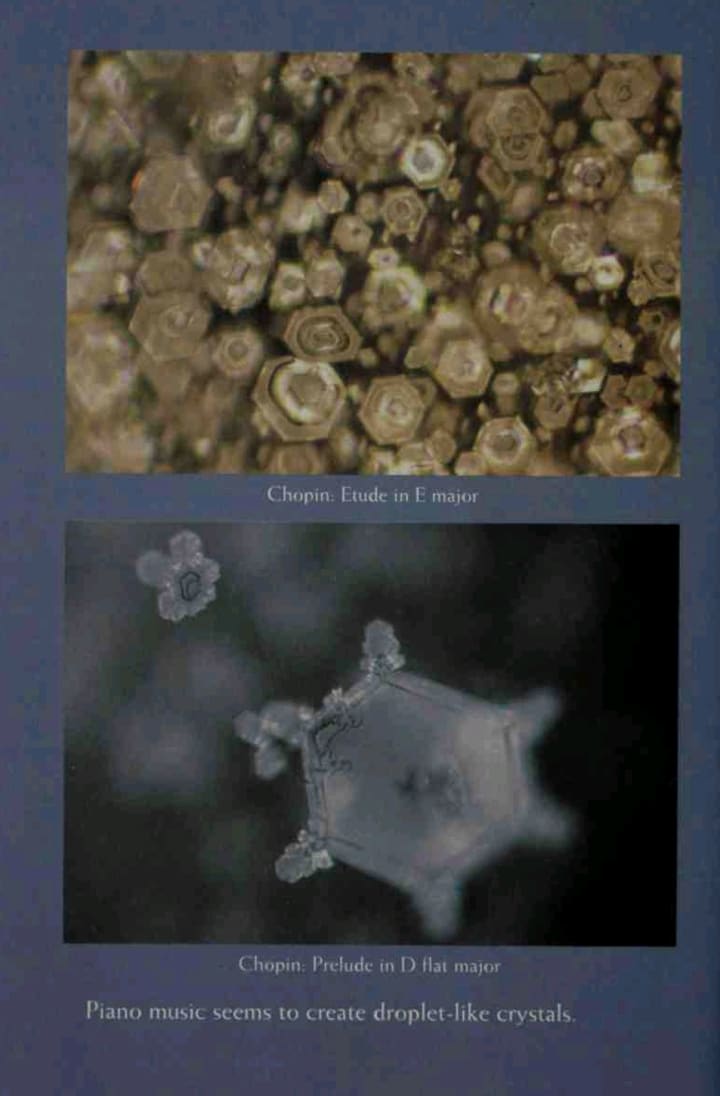 And the crystals formed by exposure to Chopin's Etude in E, Op. 10, No. 3, sur- prised us with their lovely detail.