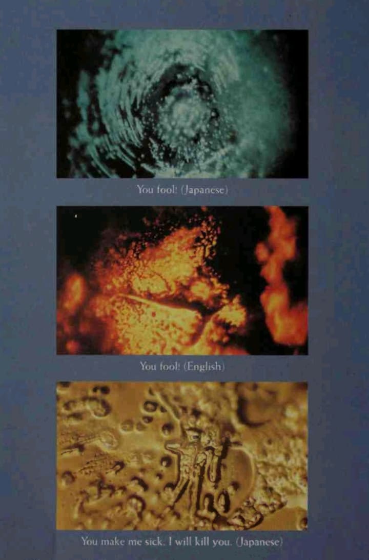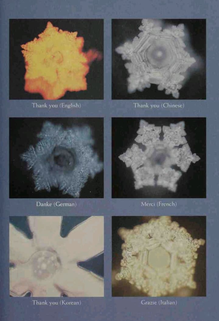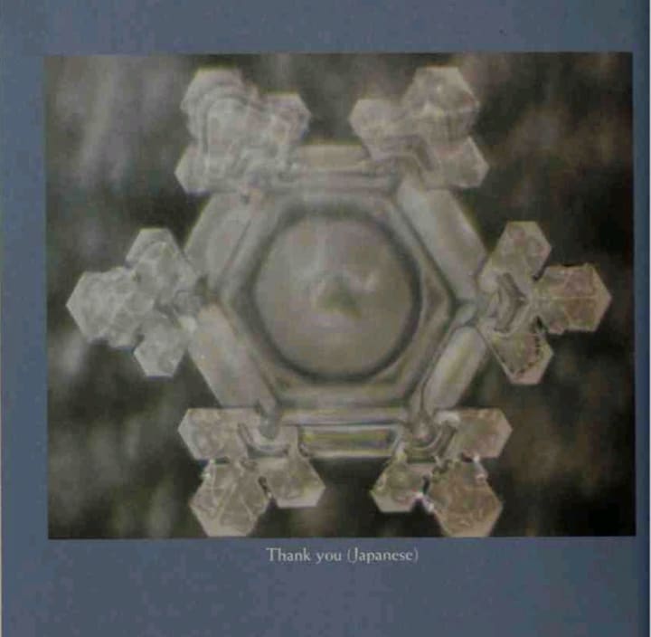 They wrote words or phrases like "Thank you" and "Fool" on pieces of paper, and wrapped the paper around the bottles of water with the words facing in. Water exposed to "Thank you" formed beautiful hexagonal crystals, but water exposed to the word "Fool" produced crystals similar to the water exposed to heavy-metal music, malformed and fragmented.