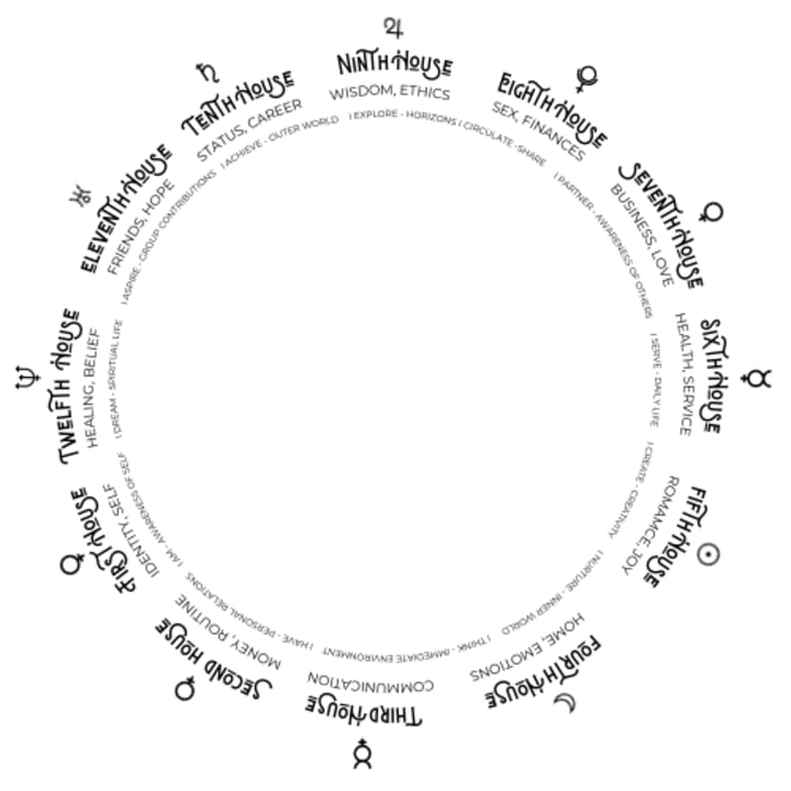 Sixth House - In this house, we find our physical and mental health rules. Called "the house of health", our personal health can be showcased here. This also houses our aide to others, skill mastery and can provide insight on how we overcome obstacles.