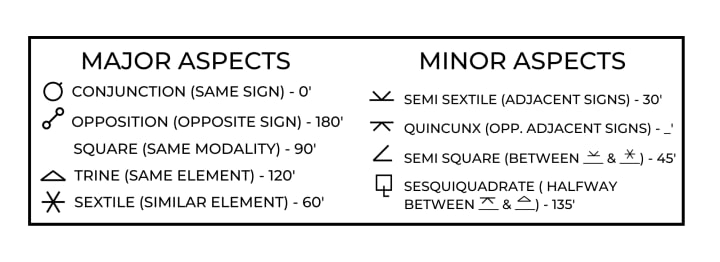 Opposition - Opposition occurs when two planets are directly across from one another on a natal chart. This creates opposing energies that work against each other, and can create or foretell challenges. An opposition will occur when two planets are 180' degrees apart and within wheel of each other across a natal chart.