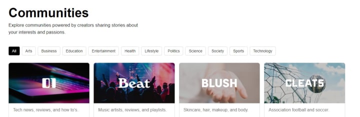 Communities do not have filters bar Top Stories, Latest Stories and collections although you can manually filter if you know the subcommunity you want to look through. If a story has a subcommunity (tag) it is shown at the end of that story. Clicking on that link will take you to that community.