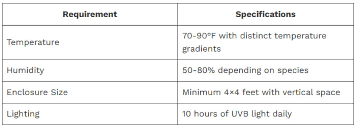 Chameleons need a lot of attention to their environment. They require specific conditions to thrive: