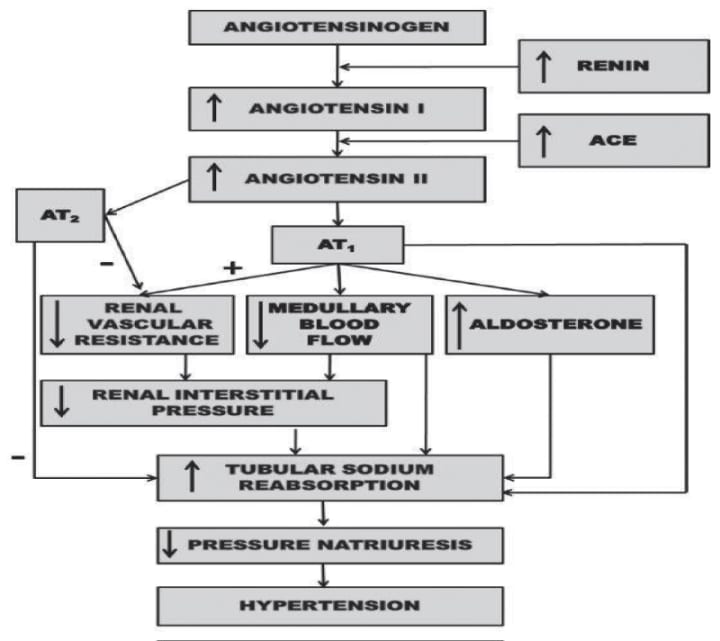The existence of local and independent control of RAS activity within the kidney is also believed to affect sodium excretion and regulation of blood pressure. In this hypothesis, the increase in circulating levels of angiotensin II is associated with the accumulation of angiotensin peptides in the kidney, the primary expression of angiotensinogen in the proximal tubal epithelium, the primary substrate RAS and the increased excretion of angiotensinogen and peptide of angiotensin in the urine. In this pathway, angiotensin II through angiotensin type 1 (AT1) receptors in the kidney induce local activation of RAS within the kidney and increase the generation of angiotensin II in the lumen of the renal tubules, resulting in results in autocrine and paracrine stimulation occurs. Epithelial transporter.