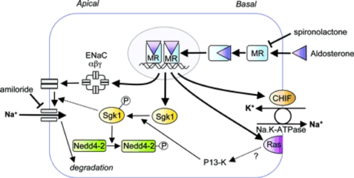 Figure 3: Representation of an aldosterone-sensitive epithelial cell. The proteins encoded by aldosterone-induced genes are discussed in the text: ENAC α, β and,, CHIEF, sgk and RAS are indicated which are their known or therapeutic functions.
