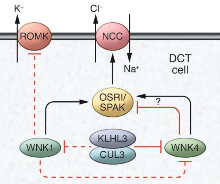 The WNK family sodium chloride cotransporters (NCC) and the kidneys regulate the activity of the external distal potassium channel (ROMK) in the cells of the distal convulsive tubule (DCT) in the kidney. WNK1 phosphorylates and stimulates SPS1-related proline / alanine-rich protein kinase (SPAK) and stress-reactive oxidative protein kinase 1 (OSR1), which in turn promotes NCC-dependent sodium transport. WNK1 can also inhibit ROMK. WNK4 inhibits ROMK, but both excitatory and inhibitory actions in NCC have been reported to occur according to the experimental system used. WNK4 levels are regulated by the activity of cullin 3-KLHL3 ubiquitin ligase, which has also been suggested to modulate WNK1.