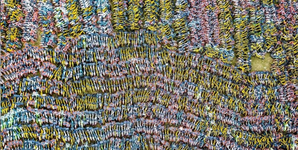 set of iconic photos from 2017 show brightly coloured fields which, at first glance, look like meadows filled with flowers in full bloom. It takes a while to register that the images aren't of verdant fields, but ones filled with bicycles: hundreds and thousands of two-wheelers, stacked end-to-end in what came to be called China's bicycle graveyards.