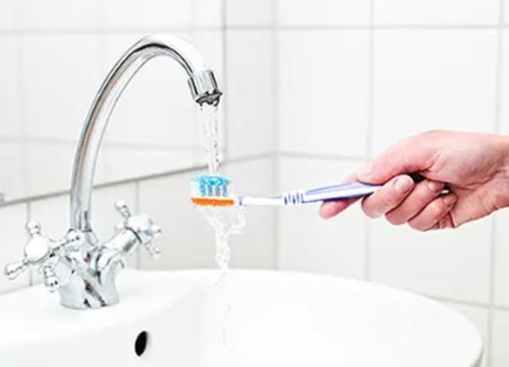 After brushing your teeth, hold your toothbrush under running tap water until you have cleaned off all remaining toothpaste and debris that have been left on the brush.