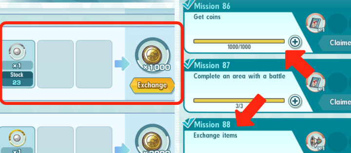 One mission is to exchange items, and another is to get 1,000 coins. Getting coins other ways beyond pearls can require a lot of grinding—some battles give you around 200 coins, while some can give you as little as 25.
