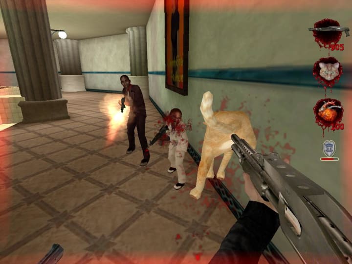 Postal 2 grants players the immunity to walk the streets and feel like a walking nightmare. Only, this nightmare uses tools such as urinating on people, and then decapitating them with a blunt shovel. And yes, that is a cat attached to the barrel of a shotgun.