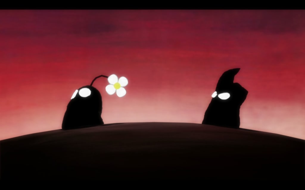 God, it’s a cute game though. And like all the best puzzle games it’s infuriatingly simple at first. You control Love, a little black blob with two cute eyes and a flower sticking out of his head, and Hate, a larger black blob with two angry eyes and spikes sticking out of his head. They’re adorable. You can move them around, they can make short hops upwards or long falls downwards, but that’s about it.