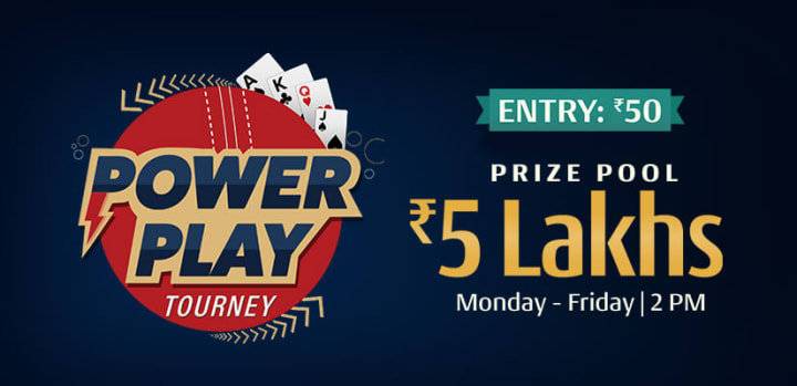 Get ready for a power-packed tourney! Take part in our Power Play Tourney and stand a chance to win from ₹80 Lakhs monthly pot. Power Play Tourney offers Prize Pool of Rs.5 Lakhs. Monday - Friday @2pm. Maximum Participants: 7,500. Winners: Top 500. First Prize: Rs.50,000 and Minimum Prize: Rs.750. Entry Fee: Rs.50.