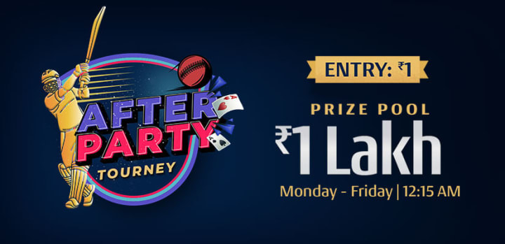 Party isn't over yet! Join our After Party Tourney and stand a chance to win from ₹30 Lakhs monthly pot with just Entry Free Rs.1. Start playing! Monday – Friday @12:15am. Maximum Participants: 10,000. Total Cash Prize: Rs.1,00,000. Winners: Top 500. First Prize: Rs.9,999 and Minimum Prize: Rs.102.