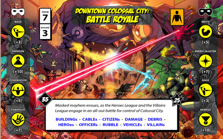 Each comic book issue is comprised of three Hero League-focused Episode cards and three Villain League-focused Episode cards. In all, there will be 42 Episode cards in the came.