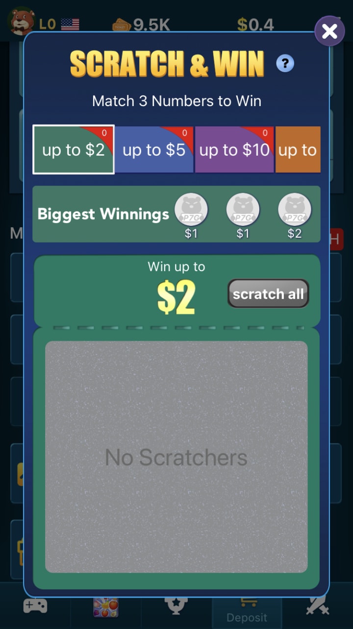 The Scratch and Win mini-game is a super simple and straightforward game where you can earn or purchase a Scratcher and get a chance at securing yourself winnings, including Tickets and Bonus Cash. This is a quick and easy way to grab yourself some extra Tickets to play the games you love.